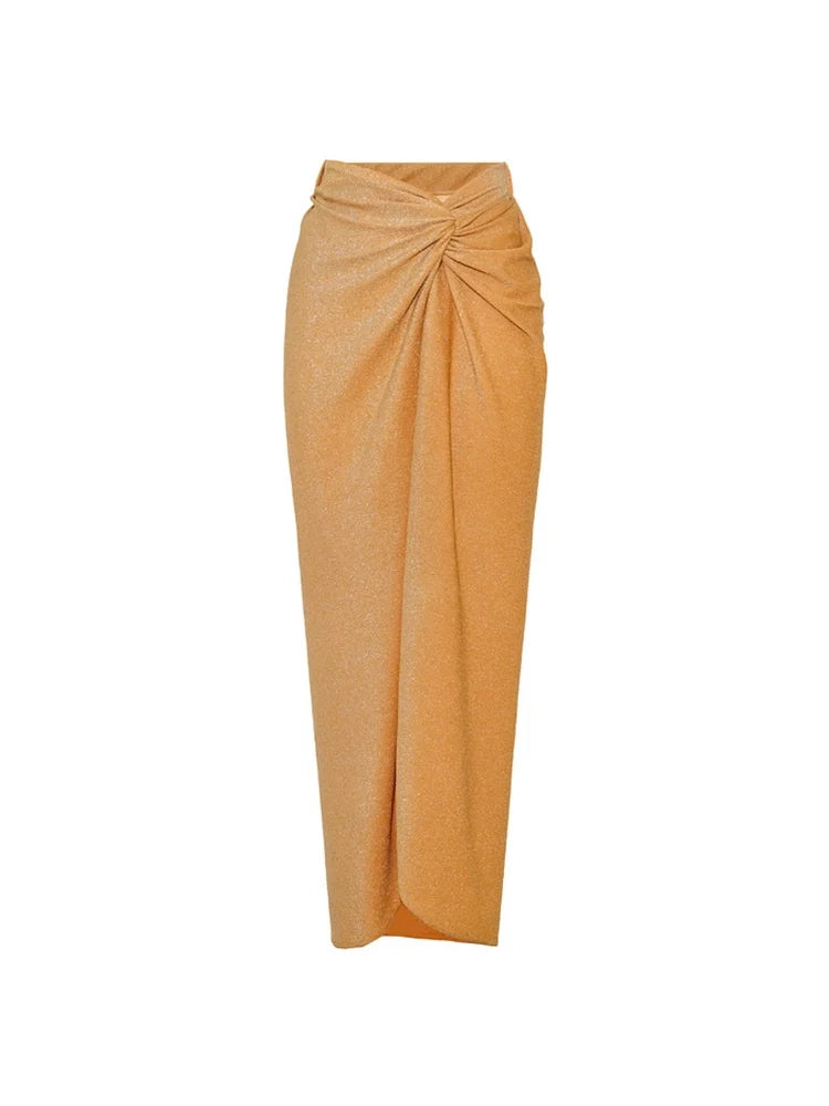Shimmer with confidence in this golden halter-neck swimsuit, designed with a sleek deep V-cut and luxe metallic finish. The clean, sculpted silhouette and minimalistic details create a high-end, fashion-forward beach look.
