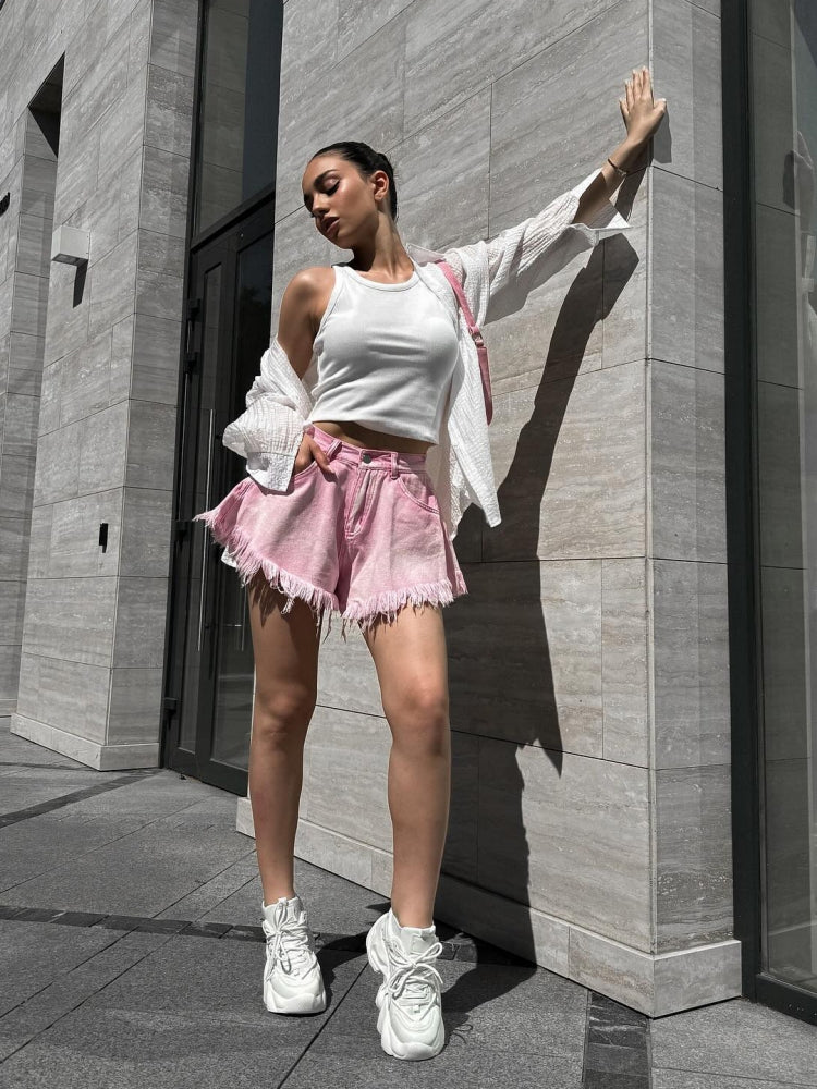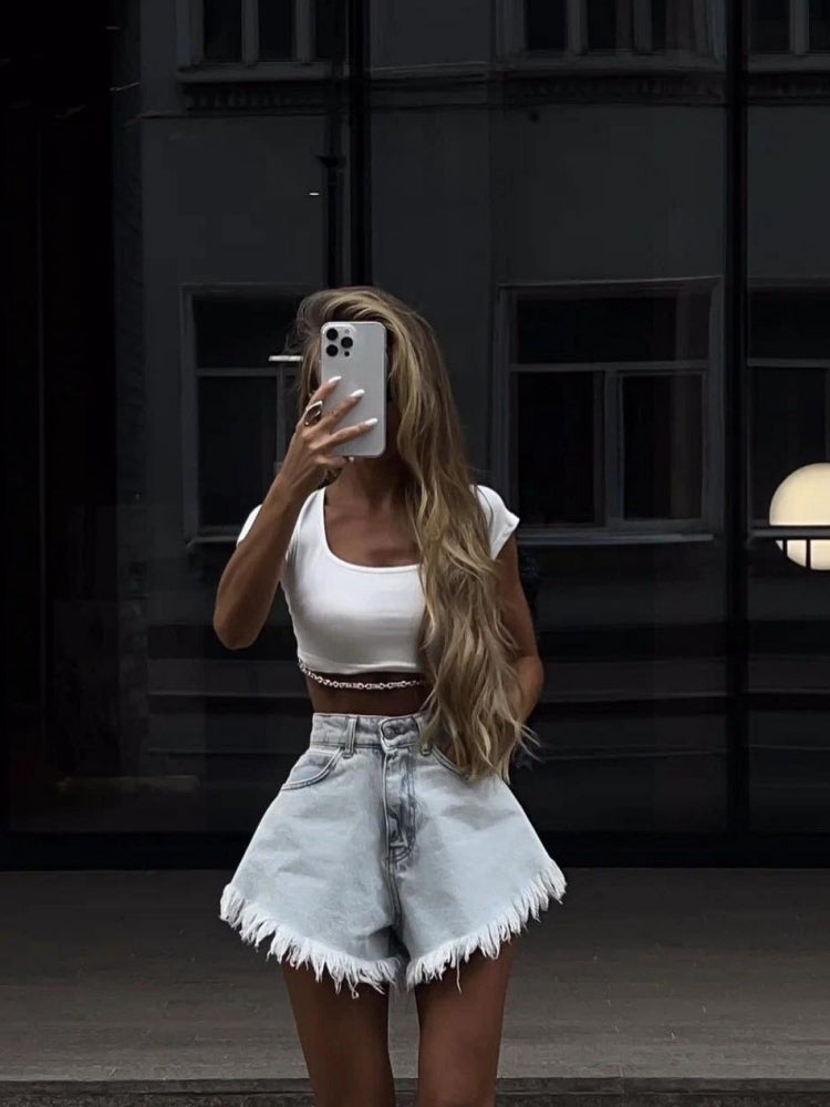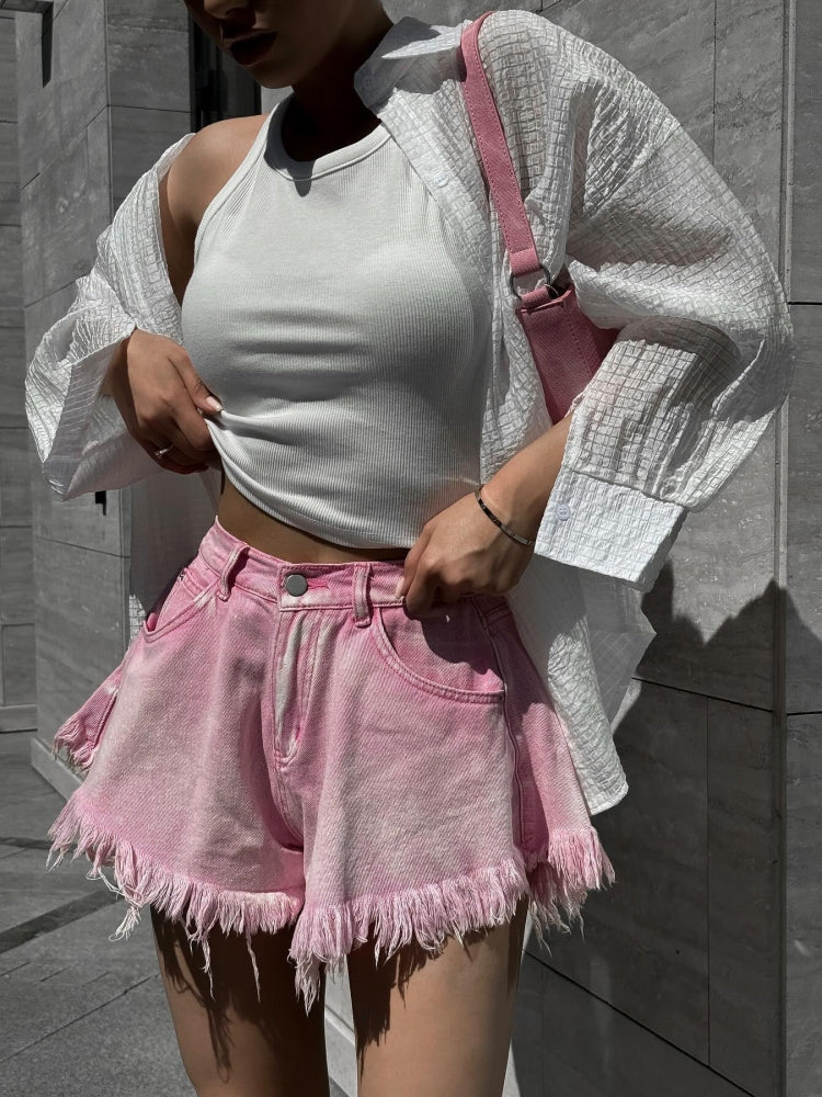 These 2024 high-waist A-line denim shorts feature a flattering wide leg cut and quality denim that holds its shape. The raw hem details and button front add trendy touches, while the high waist elongates your silhouette. Perfect for festivals, beach days, or creating stylish summer looks.