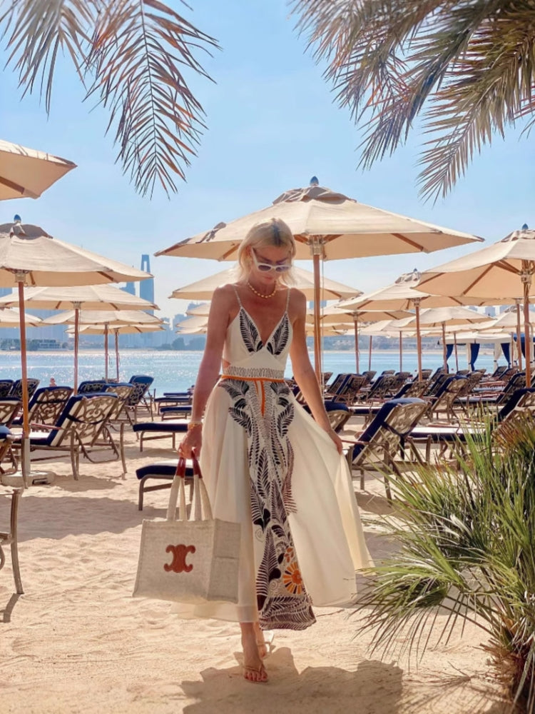 This new summer dress is made of light and breathable fabric, keeping you away from stuffiness. The romantic print adds vitality, the V-neck design modifies the neckline and makes the face look smaller, the backless tie design is sexy and unique, and the long dress version elongates the figure. It looks fresh and eye-catching for daily shopping, fits the natural atmosphere for summer picnics, shows charm for beach vacations, is elegant and appropriate for girlfriends' afternoon tea, and can stand out for light luxury dinners. Combining appearance and comfort, it easily copes with various summer occasions, making you a beautiful scene in summer.
