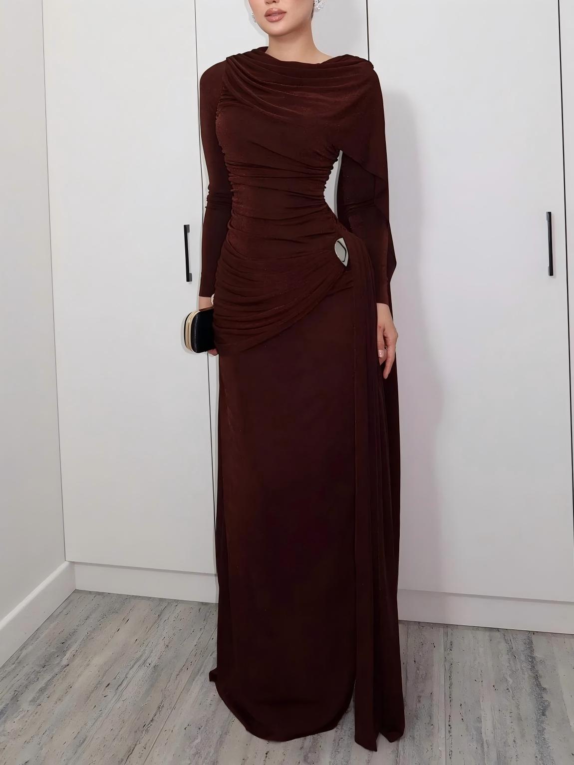 Elevate your evening look with this sophisticated maxi dress in a deep chocolate brown hue. Designed with artful draping across the neckline and bodice, it creates a fluid, sculpted silhouette that flatters from every angle. Long sleeves bring an element of refinement, while the subtle ruching detail enhances its figure-hugging design. Finished with a graceful floor-length cut, this dress is the epitome of understated glamour—perfect for formal gatherings and special occasions.