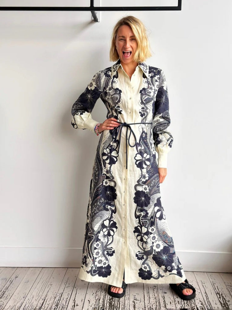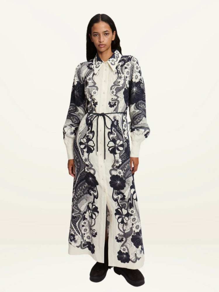 This elegant A-line dress combines a classic shirt collar and regular sleeves with a high-waist design for a polished, timeless look. The structured collar adds sophistication, while the A-line silhouette skims the body gracefully. Made from quality fabric, this versatile piece transitions seamlessly from office wear to casual outings.