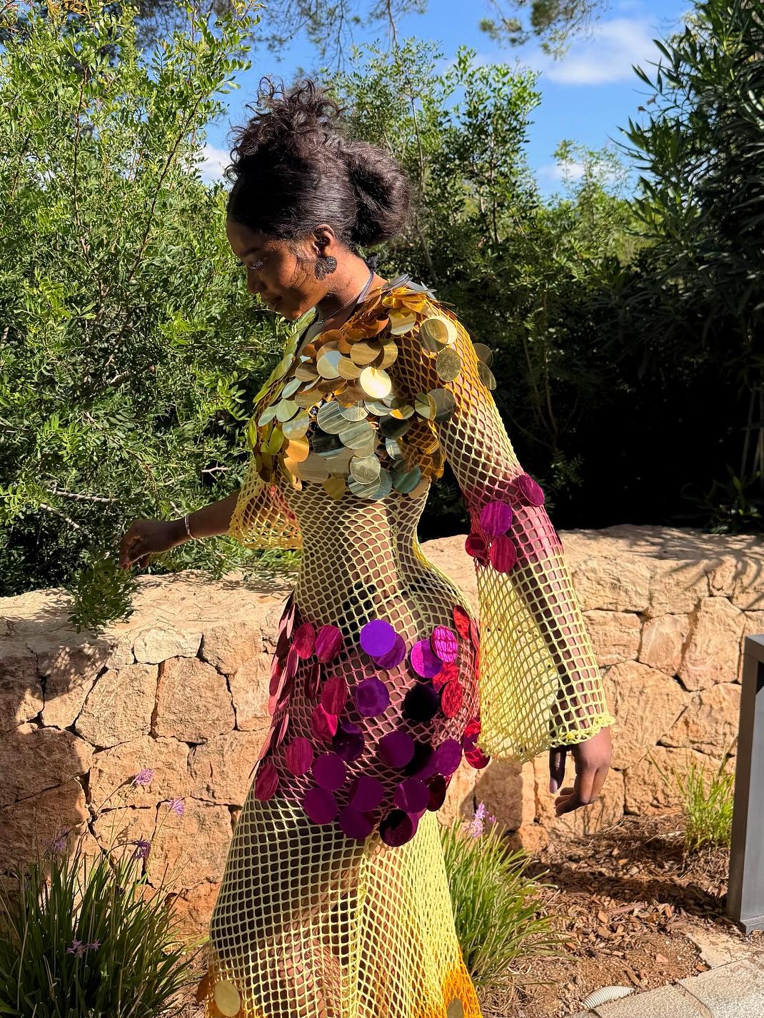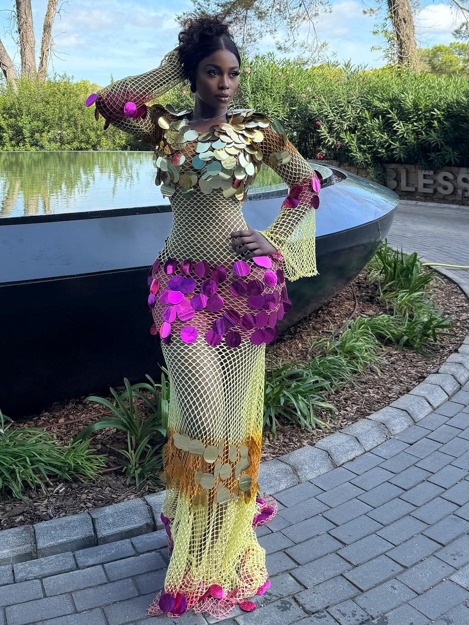 Turn heads with this yellow mesh maxi dress, dazzling with shimmering sequins and a bold, elegant silhouette.