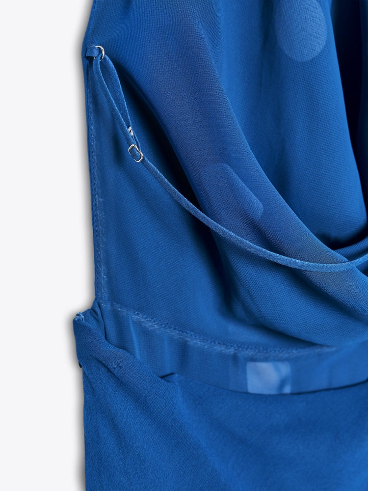Romantic and refined with a vintage twist, this polka dot midi dress features a fluid draped halter neckline that flatters the shoulders and adds elegant movement. A matching fabric scarf offers styling versatility — wear it loose, knotted, or as a chic accent.