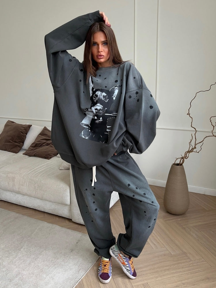 This streetwear-inspired set features bold graphic prints and a relaxed fit for ultimate comfort. The matching top and pants create a cohesive look with urban edge, while the soft fabric ensures warmth during cooler seasons. Perfect for casual outings, campus wear, or hanging out with friends.