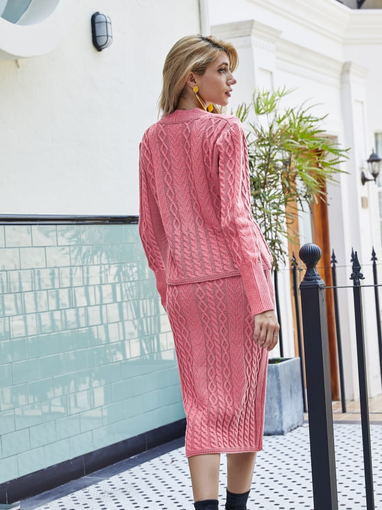 Effortlessly stylish, this Casual Knit V-Neck Sweater and Bodycon Skirt Set offers a perfect blend of comfort and sophistication. The V-neck sweater pairs beautifully with the fitted bodycon skirt, creating a flattering silhouette for everyday elegance.