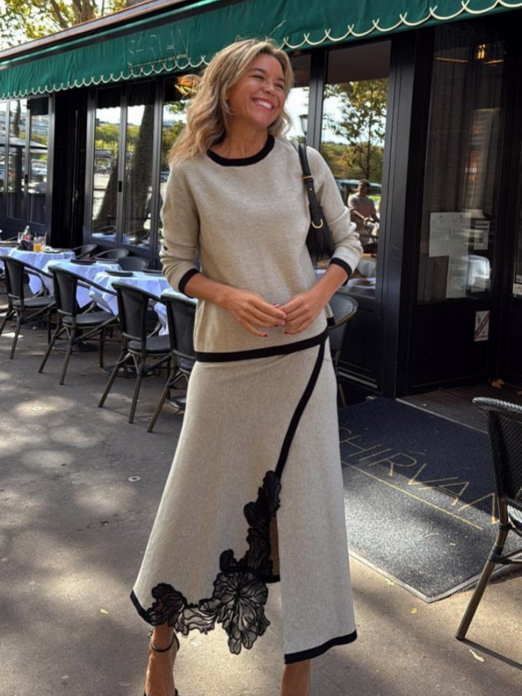 This collection features elegant two-piece sets, each consisting of a stylish top and a matching midi skirt. The tops showcase a round neckline with contrasting trim and three-quarter sleeves for a refined, balanced look, while the midi skirts are adorned with intricate lace or embroidery, sometimes accented with a chic side slit for added style and movement.