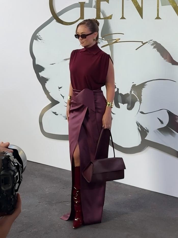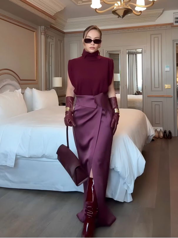 The satin wrap maxi skirt ties at the waist for a flattering fit, while its flowing silhouette moves gracefully with every step. Worn together, the coordinated set creates a polished, formal look that transitions seamlessly from high-profile events to elegant evenings out.