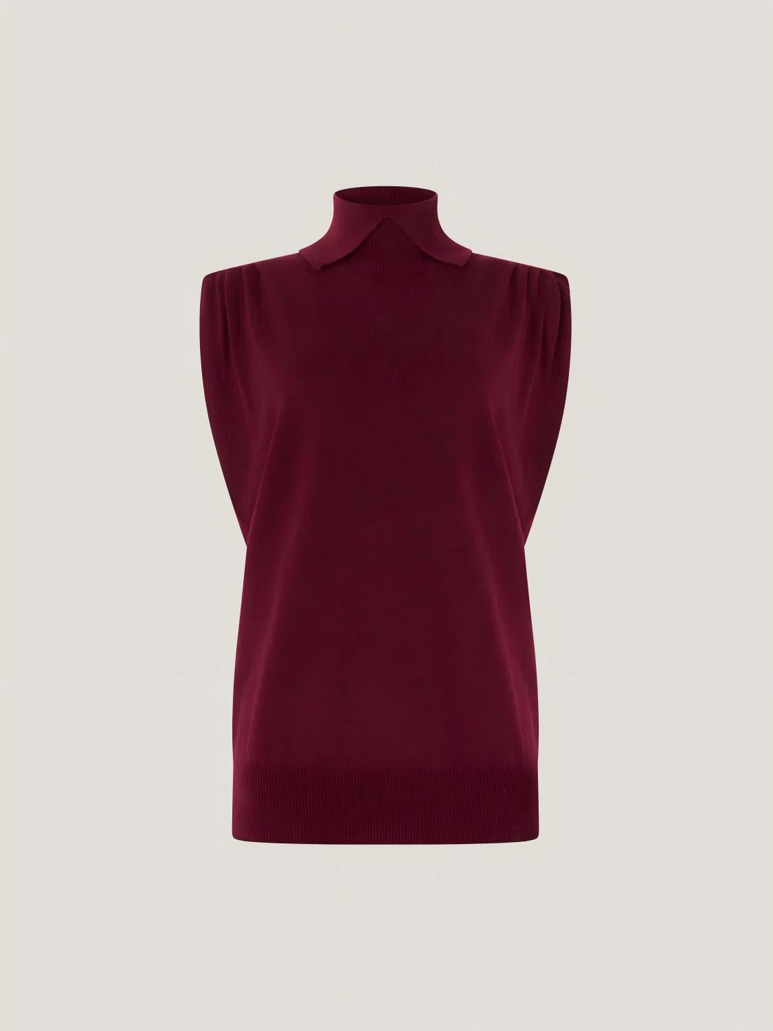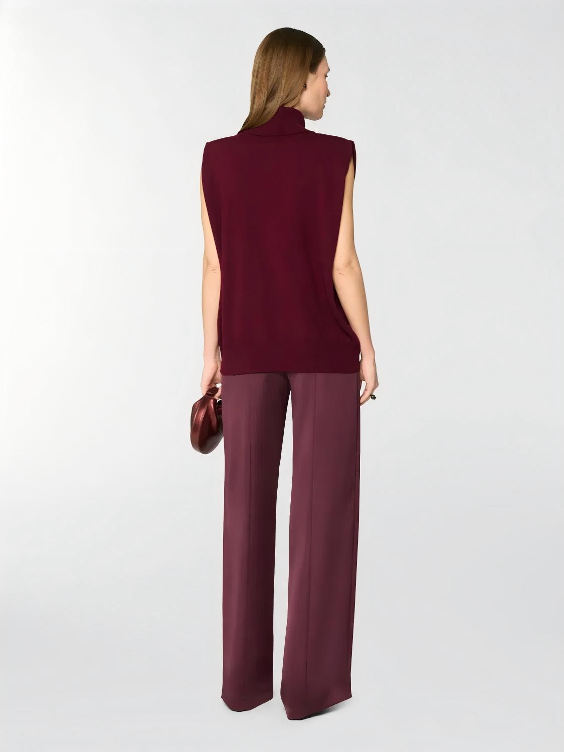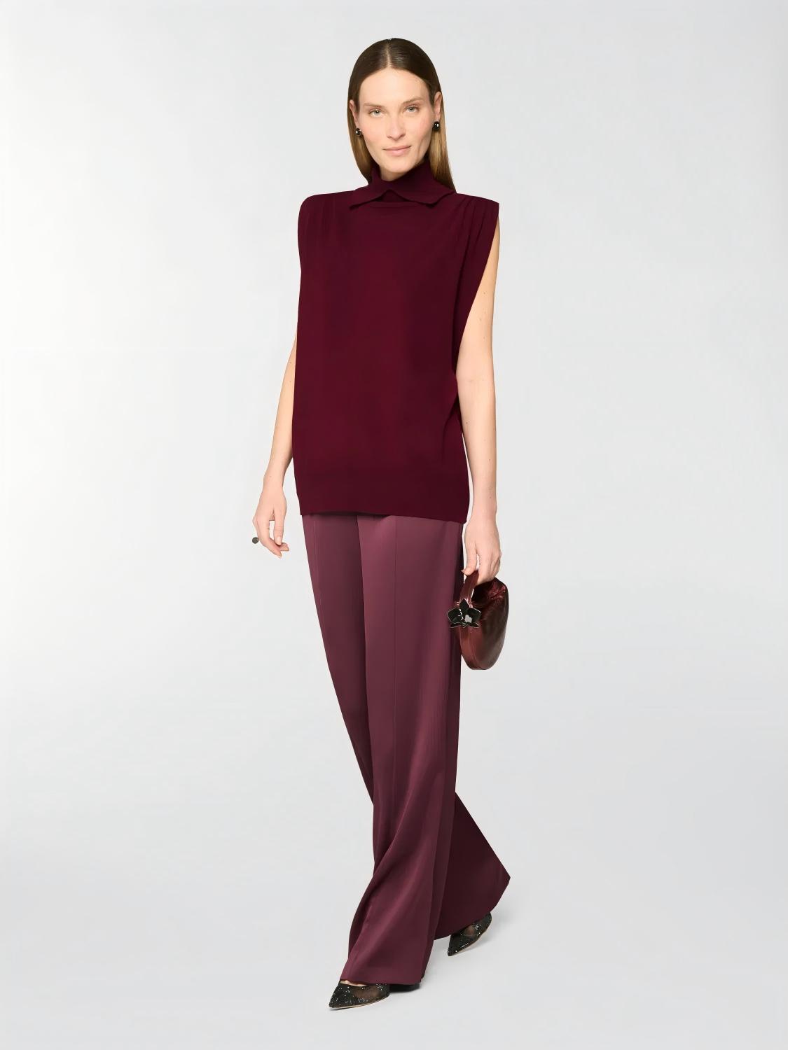 Elevate your wardrobe with this statement-making ensemble that balances sophistication with fluid elegance. The knit top features an open-front turtleneck and subtle gathers at the shoulders, adding both volume and delicacy. Designed with a fluid fit and hip-length cut, it’s versatile enough to be worn on its own or layered under a blazer for a refined touch.