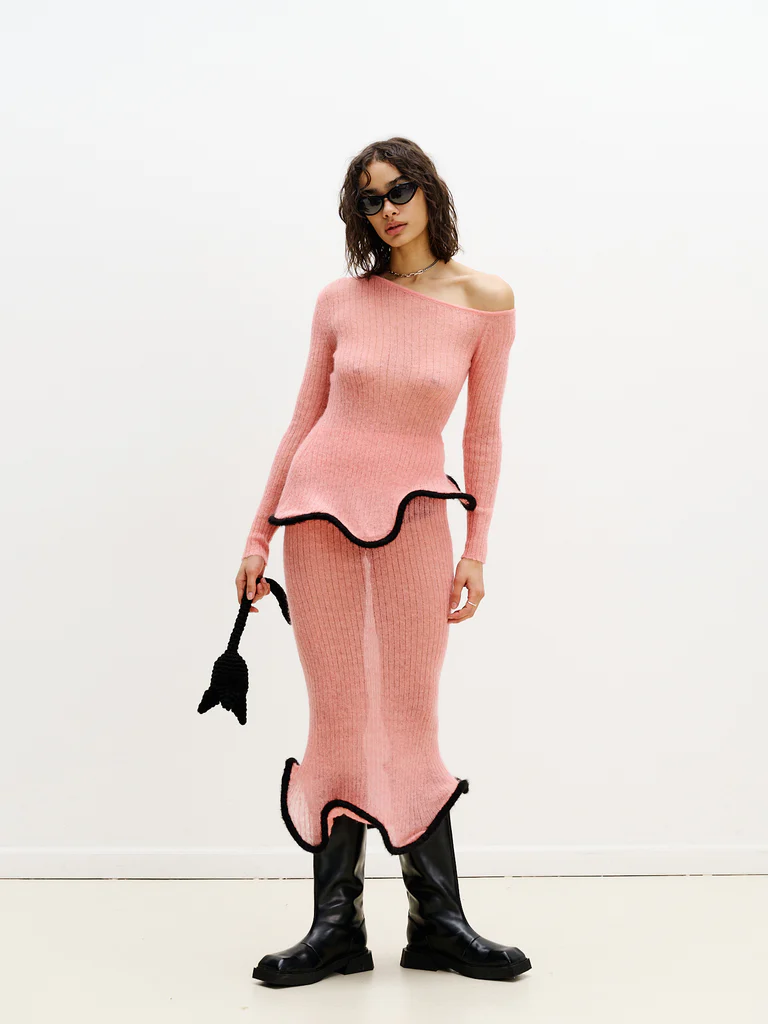 Step into modern elegance with this Ruffled Edge Knit Skirt Set, a chic two-piece designed to turn heads. The one-shoulder knit top hugs the body with refined ease, while its contrasting black ruffle hem adds a playful accent to the soft pink ribbed knit. Paired with the matching midi skirt, featuring a semi-sheer finish and mirrored ruffle trim, this set creates a perfectly balanced look of sophistication and edge.