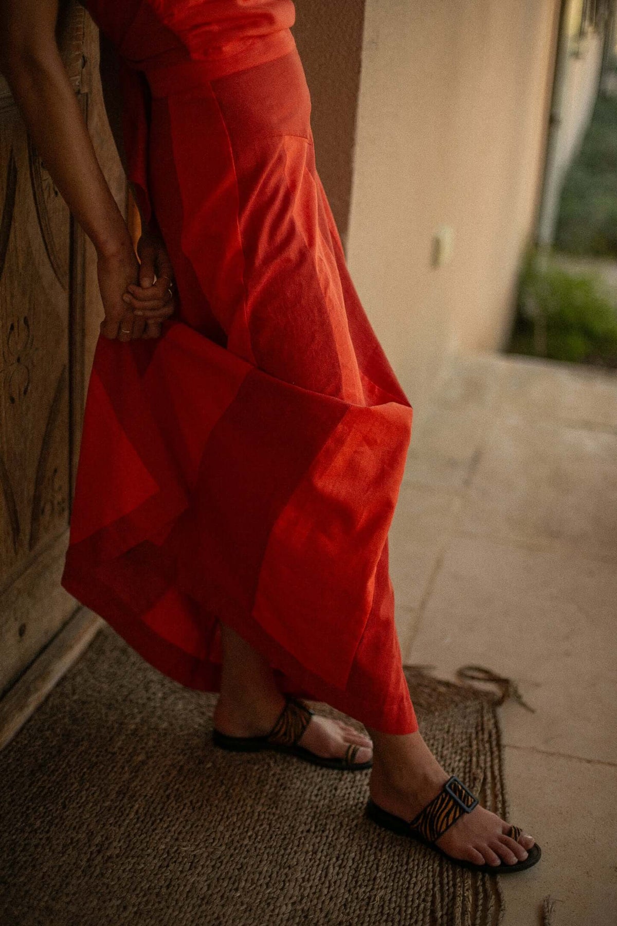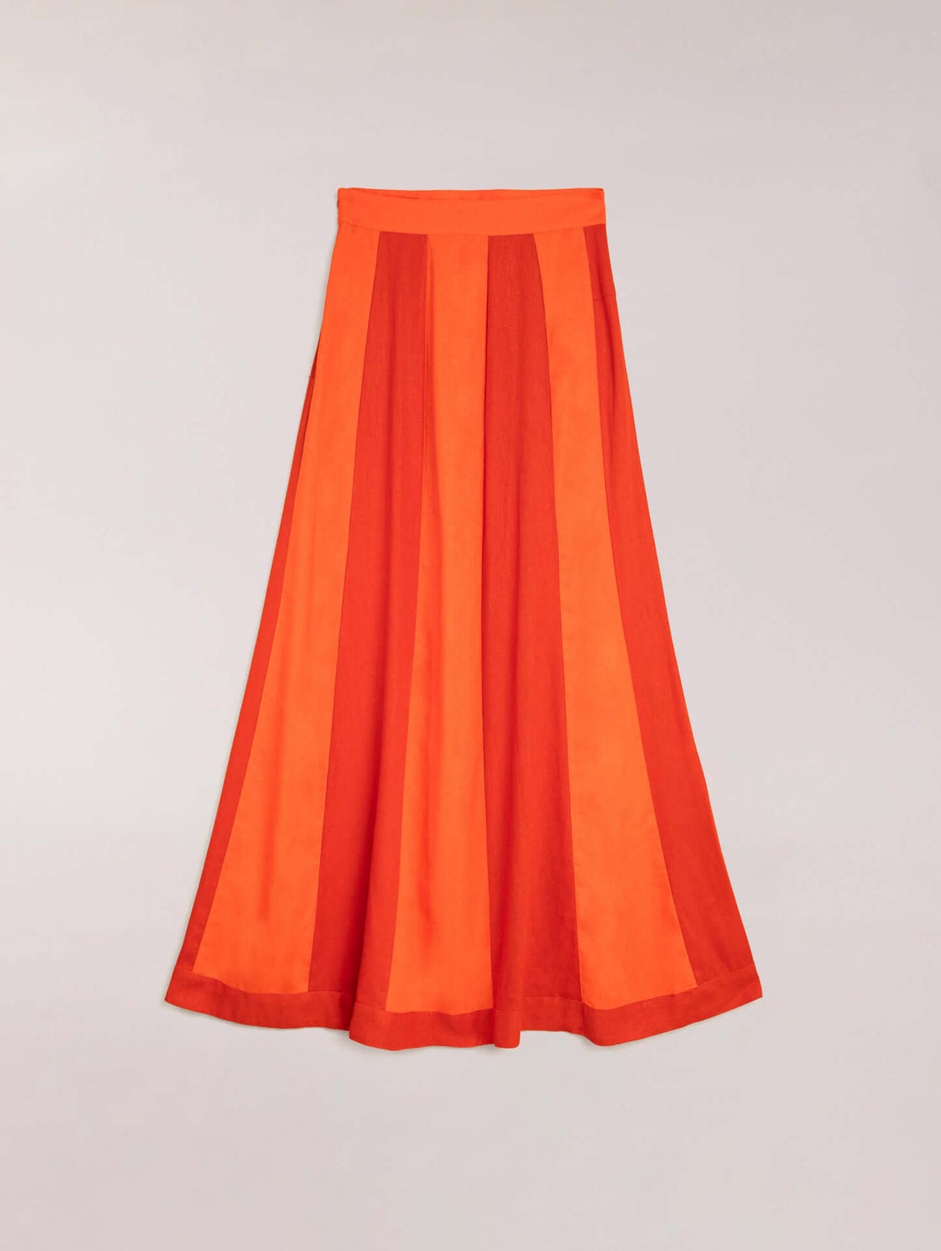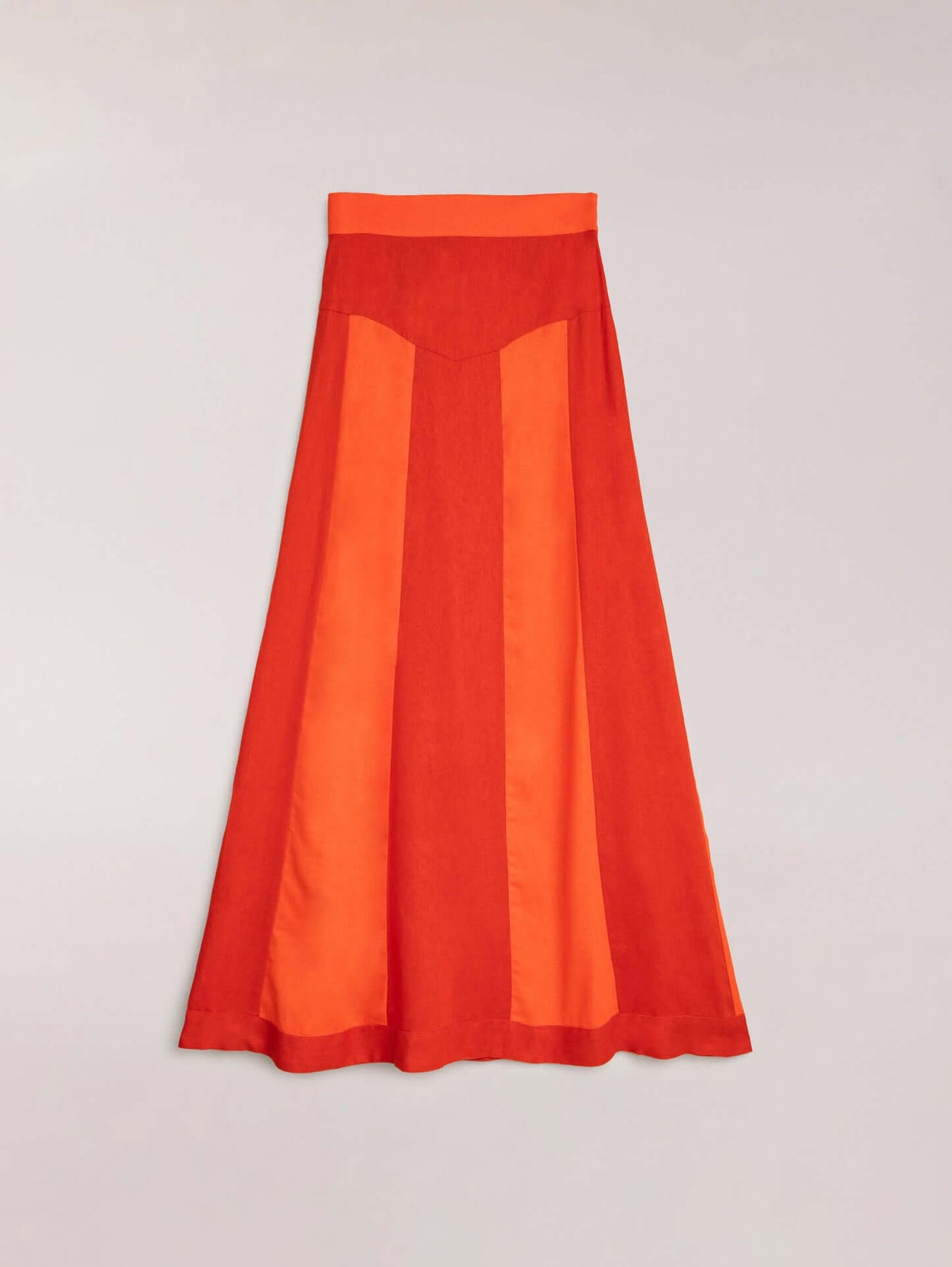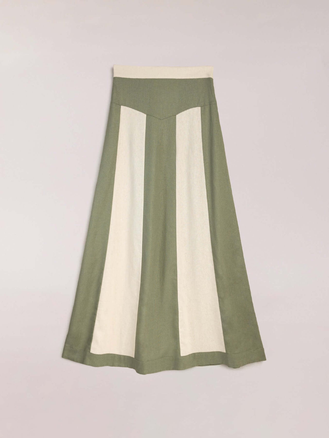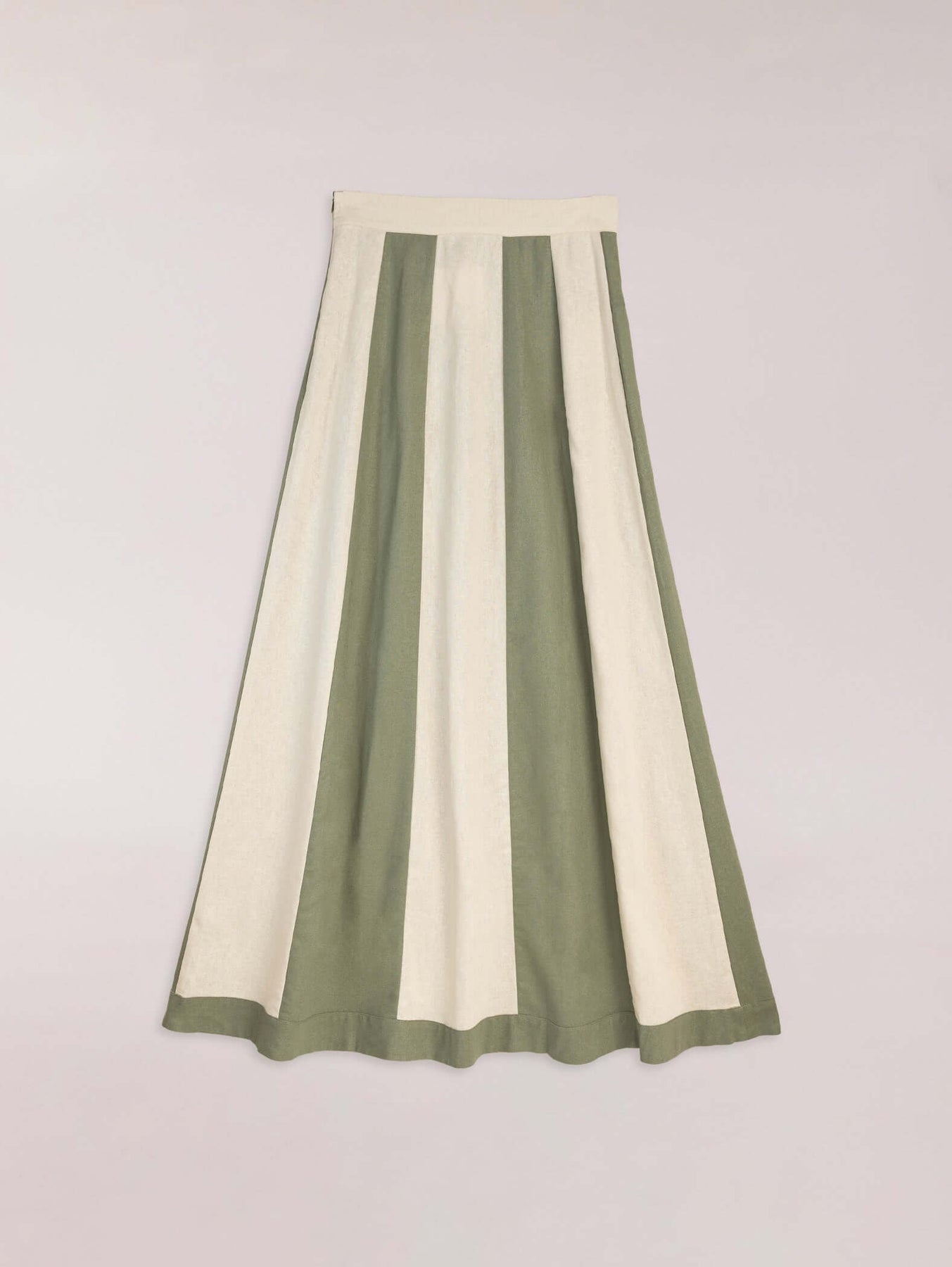 Two-tone halter top made of linen and viscose with straps to tie at the back. Long skirt made of a linen and viscose blend, characterized by cutouts that combine colors. It closes at the back.
