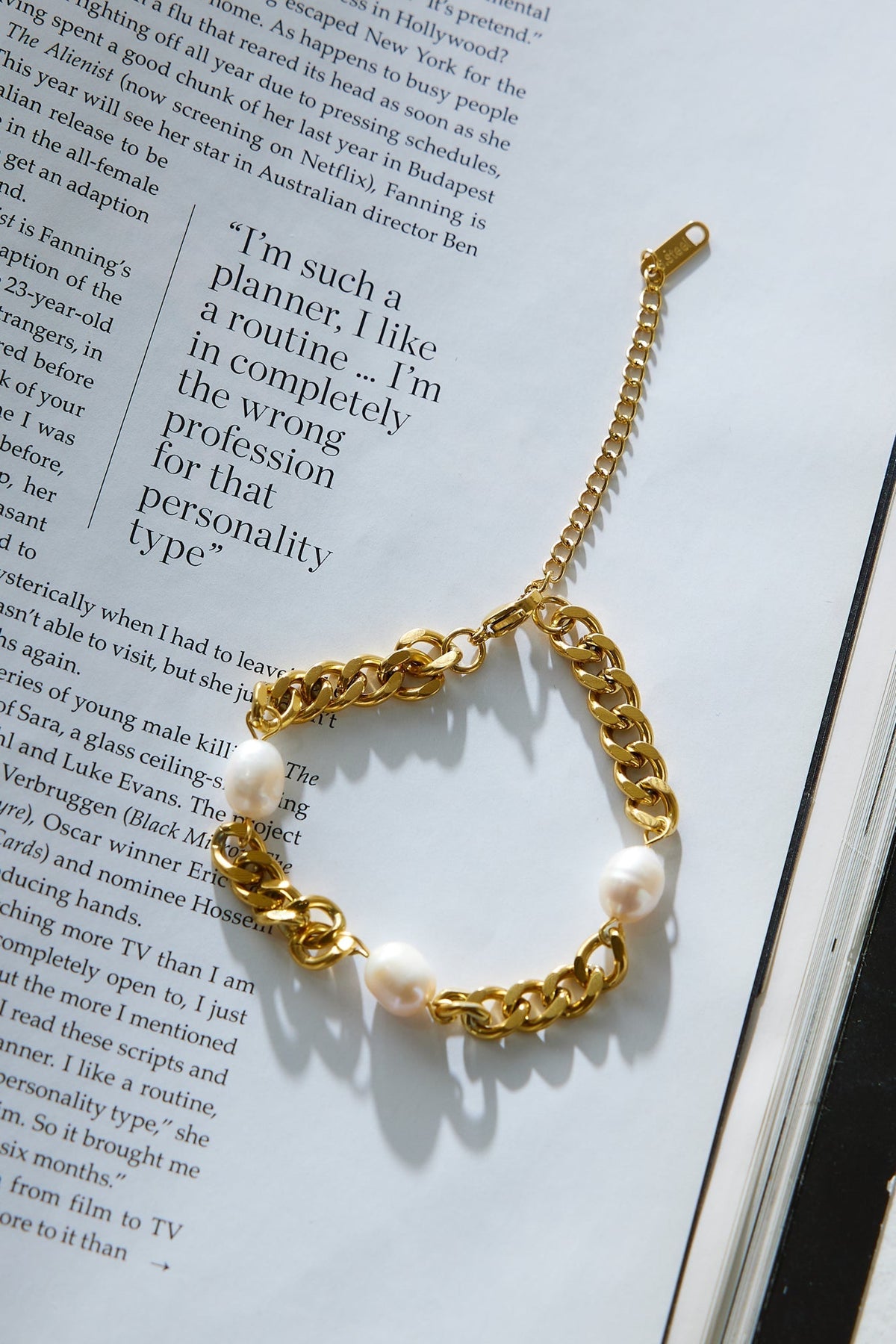 Prettiest statement bracelet you need. girl. The 18k Gold Plated Chains To Be Seen Bracelet features a pearl design and adjustable chain.